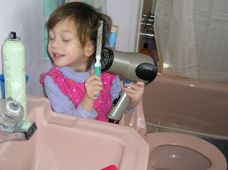 So here is a photo of the little one trying out my hairdryer. She is growing every day and for the last month has developed a love for the TV. Her first 2 years with me, she didn't care much for it. Now she is glued to the thing and that's all she wants to do. So when I took off today for a chiropracter's appointment and to see "Slumdog Millionaire" (what a grim film), she just sat in front of the TV. Whenever the sitter tried to get her to walk to the park, The Child shrieked. Hmmm.
