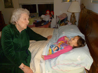 Happy Birthday Oma! I wish we could have a cake at the ready but the best I could do was send her a spiffy new version of "The Red Shoes" on DVD. Included here is a photo of Oma singing Veeka to sleep with her famous "There is a boarding house" lullaby.