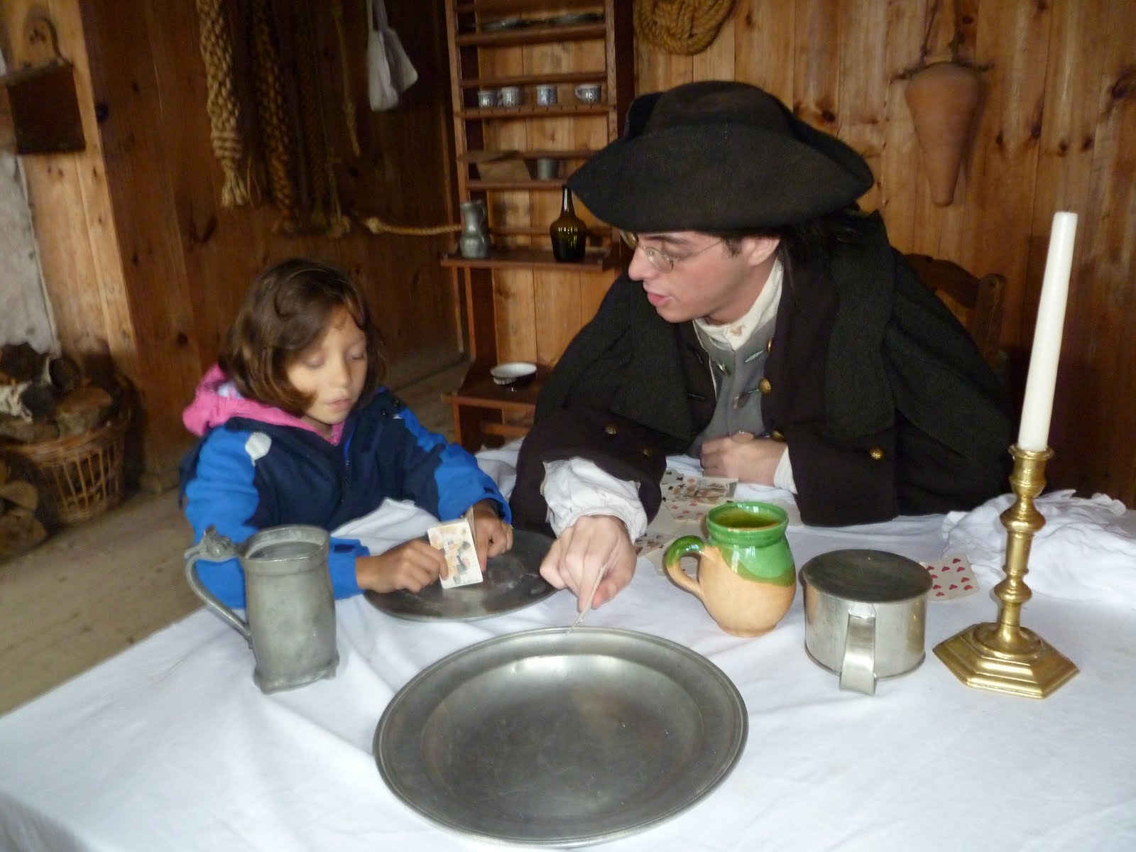 A week ago, I was on one of the prettiest parts of our continent; the portion of Nova Scotia that juts out into the Atlantic Ocean. Known as Cape Breton, it feels like part of the Scottish highlands and indeed, as I learned from visiting the Highland Village in Iona one day, a ton of Scots migrated to Canada when things got kind of bad in the old country. Not that Canada was all that much to their liking; the snow and the mosquitoes were quite a downer but the land is so reminiscent of Scotland. As I drove to my host's place just south of Sydney, I felt like I was driving along a firth. Everything was foggy, misty and green. I was quite taken by all the place signs having English/Gaelic translations.We had scheduled two days there but that turned into 3 because the weather was awful and there was so much to see. Our second day there, we went to Louisbourg, a huge fort on the southern coast of the cape that was built by the French but taken over by the British in the mid-18th century. The place is larger than Williamsburg and frozen in time in 1744 which is how all the people are dressed there. One is confronted by soldiers asking if you speak French or English; given carding and spinning lessons and shown the dances of the day. One of the photos shows Veeka being very taken by a young man dressed in colonial garb in one of the homes who showed her how to play cards. She and I also found ourselves eating lunch at a restaurant where the only utensil was a spoon.I bundled Veeka up quite a bit, as the weather was windy and about 50 degrees - and this was mid-July. Louisbourg has horrific weather all the time and one wonders why the French built a fort in such a nasty locale. It's true the harbor was quite handy but friendly ships as well as unfriendly ones crashed on the rocks just outside the harbor.On our third day on the cape, the bad weather finally broke and the sun poured down. We bade good-bye to our kind hosts and started on a 400-mile trek (yes in one day) around the famed Cabot Trail, that goes around the northern-most part of Cape Breton. This isolated peninsula is mostly a national park; it's also the Big Sur of the Far North with similar views, crashing waves against cliffs, etc. So on a bright, sunny Sunday morning, we headed up St. Ann's Bay past numerous stores selling Gaelic books and music, past some gorgeous coves, then braved 12 percent inclines (US highways have 9 percent inclines at the most) up the Cape Smokey mount for even better views. Throngs of motorcyclists were out that day as well. We then descended to Ingonish, a resort town with a tiny ski area that is the major lodging place for summer visitors. It's situated around a pretty harbor and again, I would have stopped there in a minute had I two, instead of one, days, to explore the region.Then we entered the national park portion of the cape, stopped at Green Cove, where Veeka adored clambering around all the rocks, then ended up at Neil's Harbour, a fishing port, for lunch at the Chowder House, a place with killer views of the ocean. A local fisherman showed me the piles of lobster and crab traps they use (bottom photo) and said there's so much crab, a fisherman can catch a whole year's allotment in the first two days of the season. I met a bunch of people throughout my trip who make a living fishing and my host in PEI even got up at 4 a.m. daily to fish for oysters. That kind of lifestyle is becoming quite rare in the US but it's not hard to find folks who live off of it in Atlantic Canada. As my hosts near Sydney told me, there are very few jobs in their region, so many of the young people have left Cape Breton to move to the States or to western Canada where there's plenty of work mining oil sands.I would have liked to have headed further north towards Meat Cove or at least driven by White Point, just north of Neil's Harbour where the views are said to be the best, but we had to push inland through two huge valleys where I was constantly putting my Subaru in second gear to get up and down the grades. Atop one of the mountains, everyone (including about 100 motorcyclists) were stopped, ogling a large moose in a nearby field. (There are lots of highway signs in Canada telling you to beware of moose who wander onto the roads). It was at this point we were the furthest east of our trip and the slant of the sunlight and the pine trees and rocks and birches and sparse vegetation was almost boreal - very northern woods at high altitudes. Purple and yellow flowers everywhere.Finally we popped out on the western side of the trail at Pleasant Bay and the views from there and for the next 40 or so miles going south were truly spectacular. Soaring vistas of blue sea and green mountains; many gulls. There were so many pleasant towns such as Inverness and Mabou that I wanted to linger in. Near Cap le Moine there was the funniest road-side display of dozens of scarecrows. Apparently Joe's Scarecrow is quite famous and we were asked to leave a donation for the upkeep of this display. Veeka liked wandering around giving hugs to the 'crows. We spent the afternoon coasting down the route leading back to the Corso Causeway - got there at 6 pm as I'd wished but then I had a 3-hour trip to Halifax to get to where we were supposed to spend the night. Got there at 9 pm and collapsed. Thank God for lingering light during long summer evenings.
