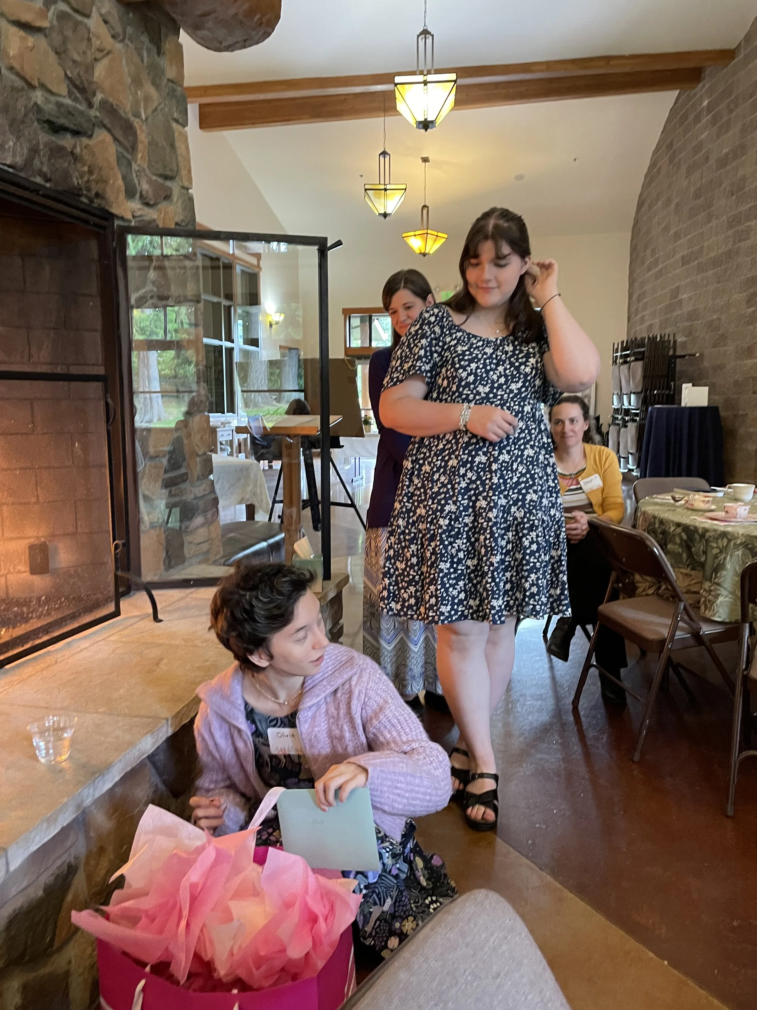 Veeka (foreground) and Abby (standing) open gifts at the graduation tea at our church